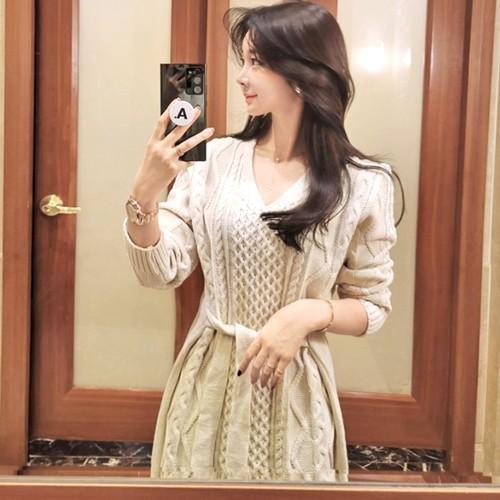 ケーブルソフトニットワンピース P レディース Ops 韓国 ファッション ワンピース ミニワンピース ショート丈 ニットワンピース ケーブル 長袖 Vネック デコルテ カジュアル かわいい ガーリー フェミニン 春 Style